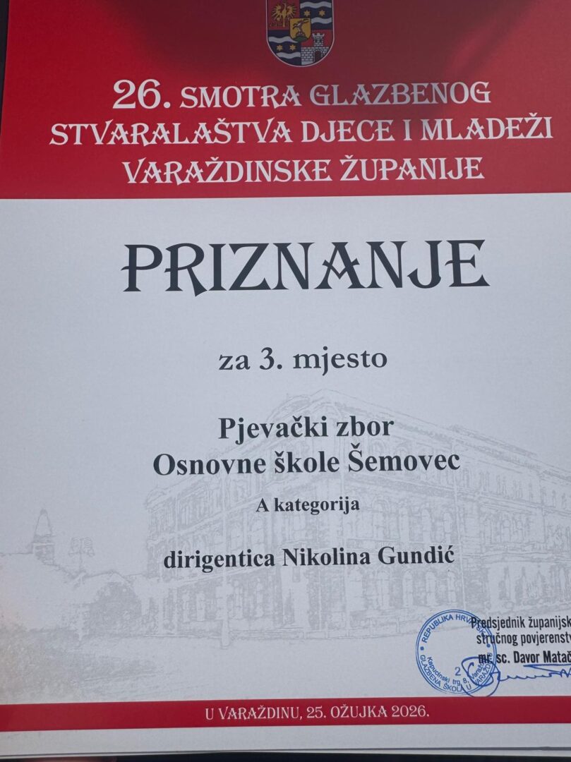 U srijedu, 25. ožujka 2025. u velikoj koncertnoj dvorani Hrvatskoga narodnog kazališta Varaždin održala se svečana 26. Smotra glazbenog stvaralaštva djece i mladeži Varaždinske županije u kojoj je sudjelovao zbor Osnovne škole Šemovec.